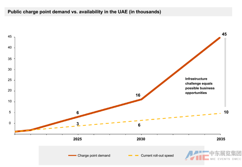 如果要實現(xiàn)電動汽車在道路上所占份額的目標,到2035年,充電站預(yù)計需求將達到4.5萬個,目前在阿聯(lián)酋各地部署了大約2000個公共充電點,有著巨大是市場空間。