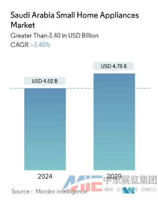 以沙特為例,據(jù)Mordor Intelligence預(yù)測,2024年沙特小家電市場規(guī)模將達(dá)到40.2億美元,到2029年將達(dá)到47.5億美元,在預(yù)測期內(nèi)(2024-2029年)復(fù)合年增長率為3.4%。