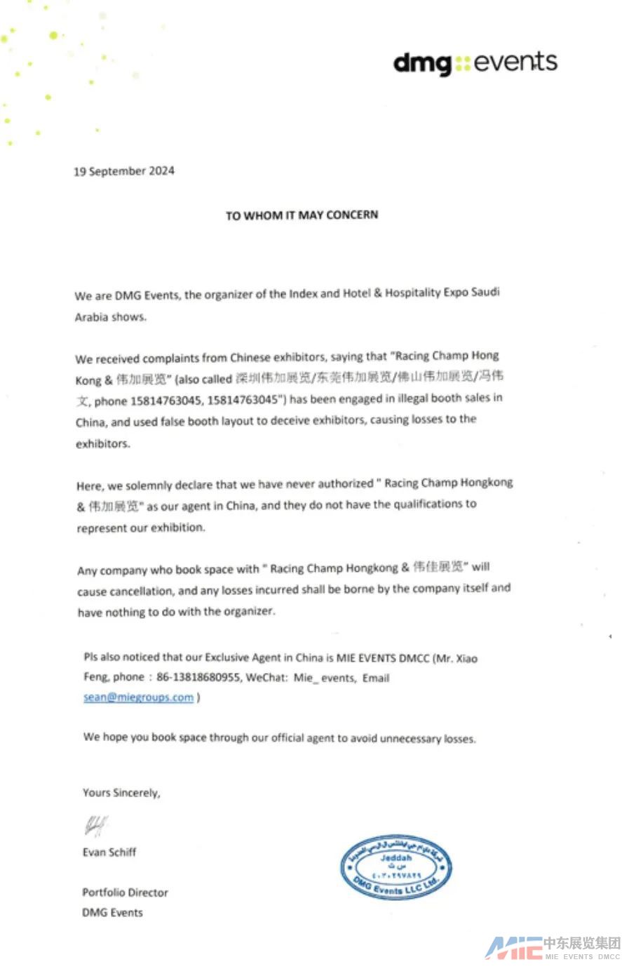 ▲沙特酒店展授權(quán)函