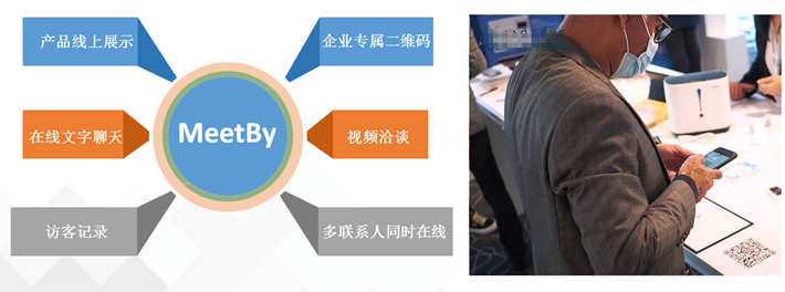 采購商現(xiàn)場掃描即可進入企業(yè)MeetBy平臺主頁,瀏覽產(chǎn)品并與采購商文字或視頻洽談!